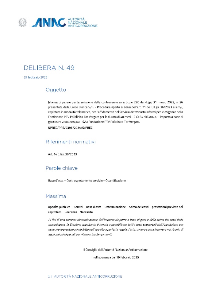 Il 19 febbraio scorso l’ANAC, con il parere di precontenzioso n. 49/2025, si è pronunciata sulla delicata questione della sottostima, da parte della Stazione appaltante, dell’importo posto a base d’asta, ribadendo come, in tal caso, la gara debba essere necessariamente annullata.