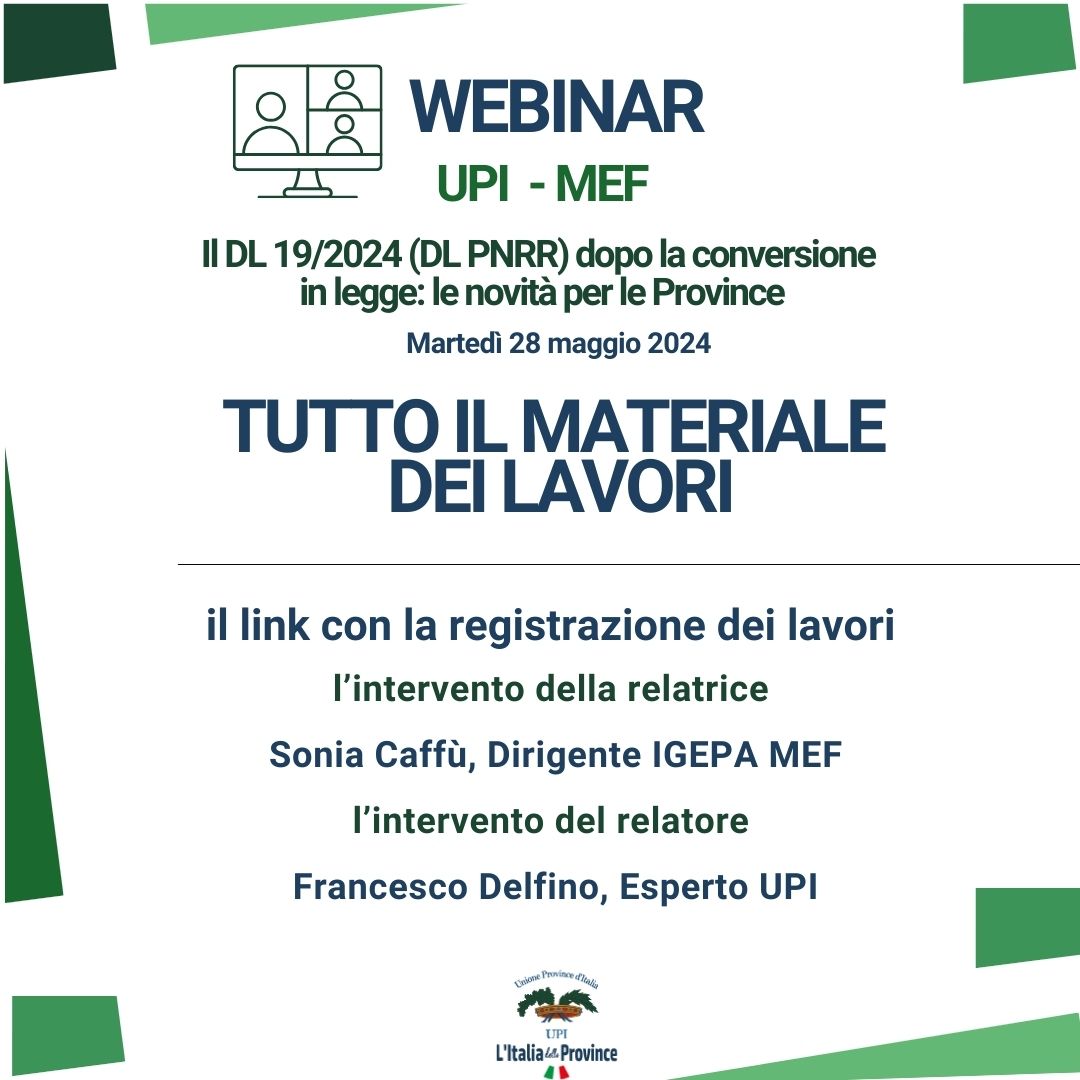 MATERIALE WEBINAR: “Il DL 19/2024 (DL PNRR) dopo la conversione in legge: le novità per le Province“