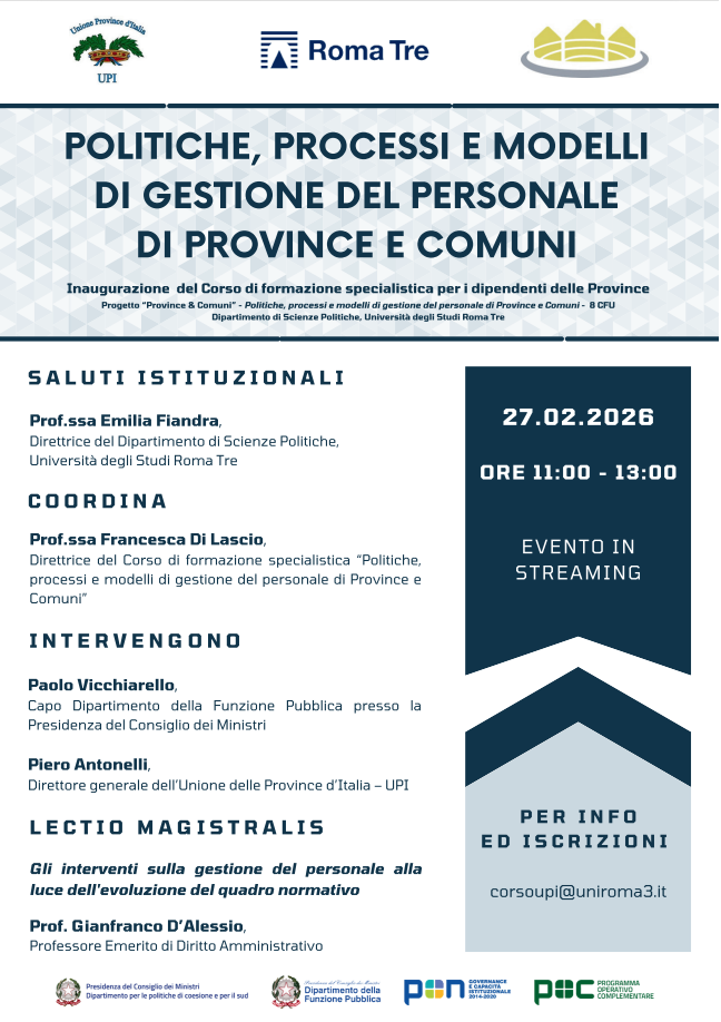Si terrà venerdì 27 febbraio 2026 dalle ore 11:00 alle ore 13:00 in modalità streaming l’evento di inaugurazione del Corso di formazione specialistica “Politiche, processi e modelli di gestione del personale di Province e Comuni”, promosso dal Dipartimento di Scienze Politiche dell’Università degli Studi Roma Tre, in collaborazione con l’Unione delle Province d’Italia.