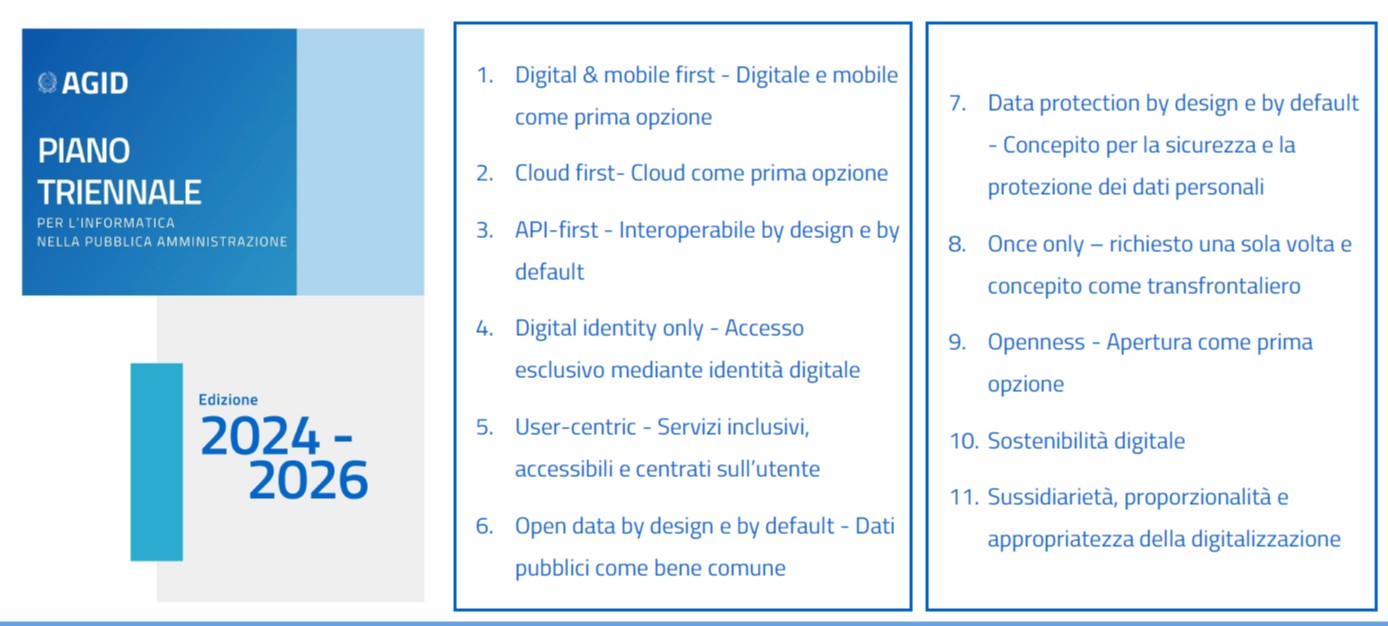 Poi presenta i Principi guida, ovvero i punti fermi che devono guidare il processo di transizione al digitale in ogni fase di implementazione, declinandoli nello specifico della missione istituzionale di ogni ente pubblico.