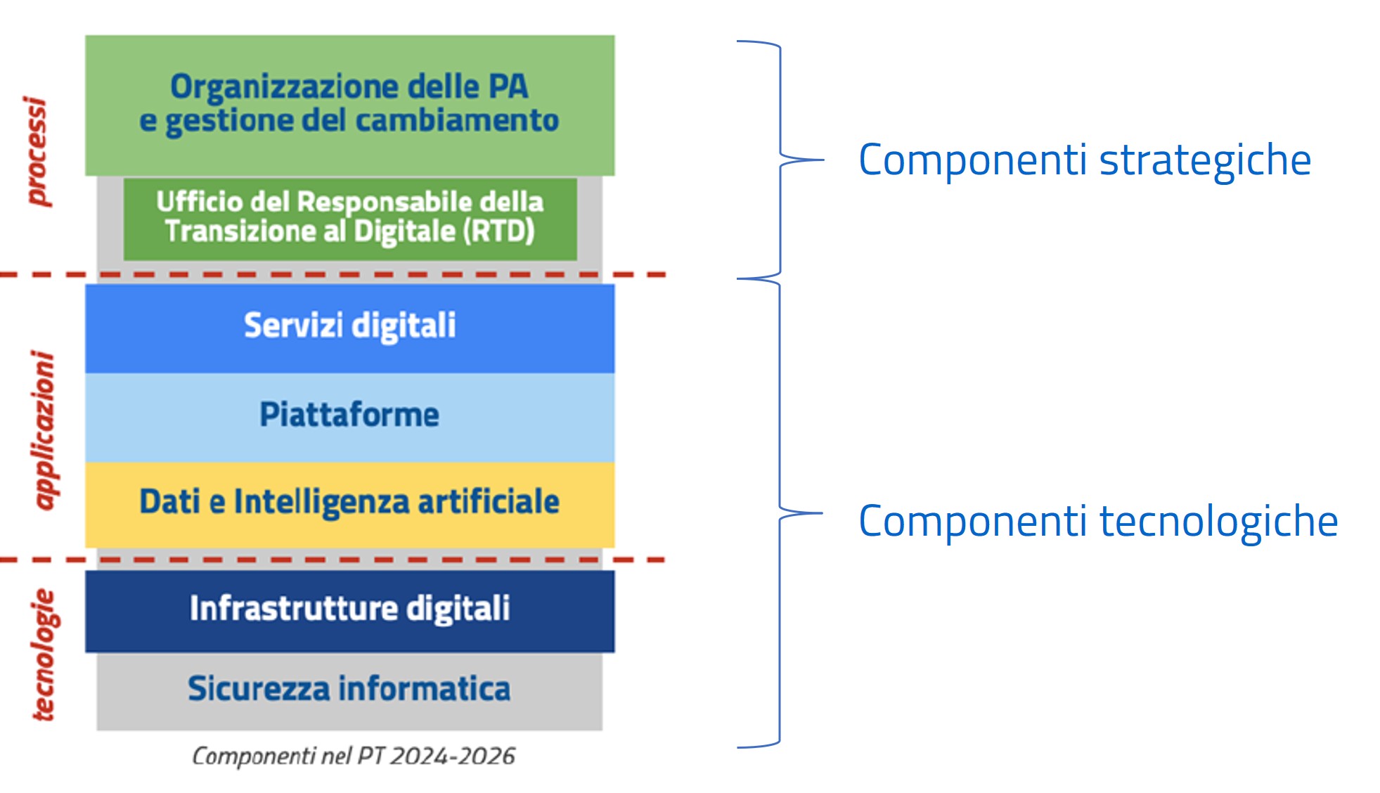 Ricordiamo che il Piano Triennale prevede due componenti suddivise in processi (prima componente), applicazioni e tecnologie (seconda componente), come riportato nella figura di seguito.