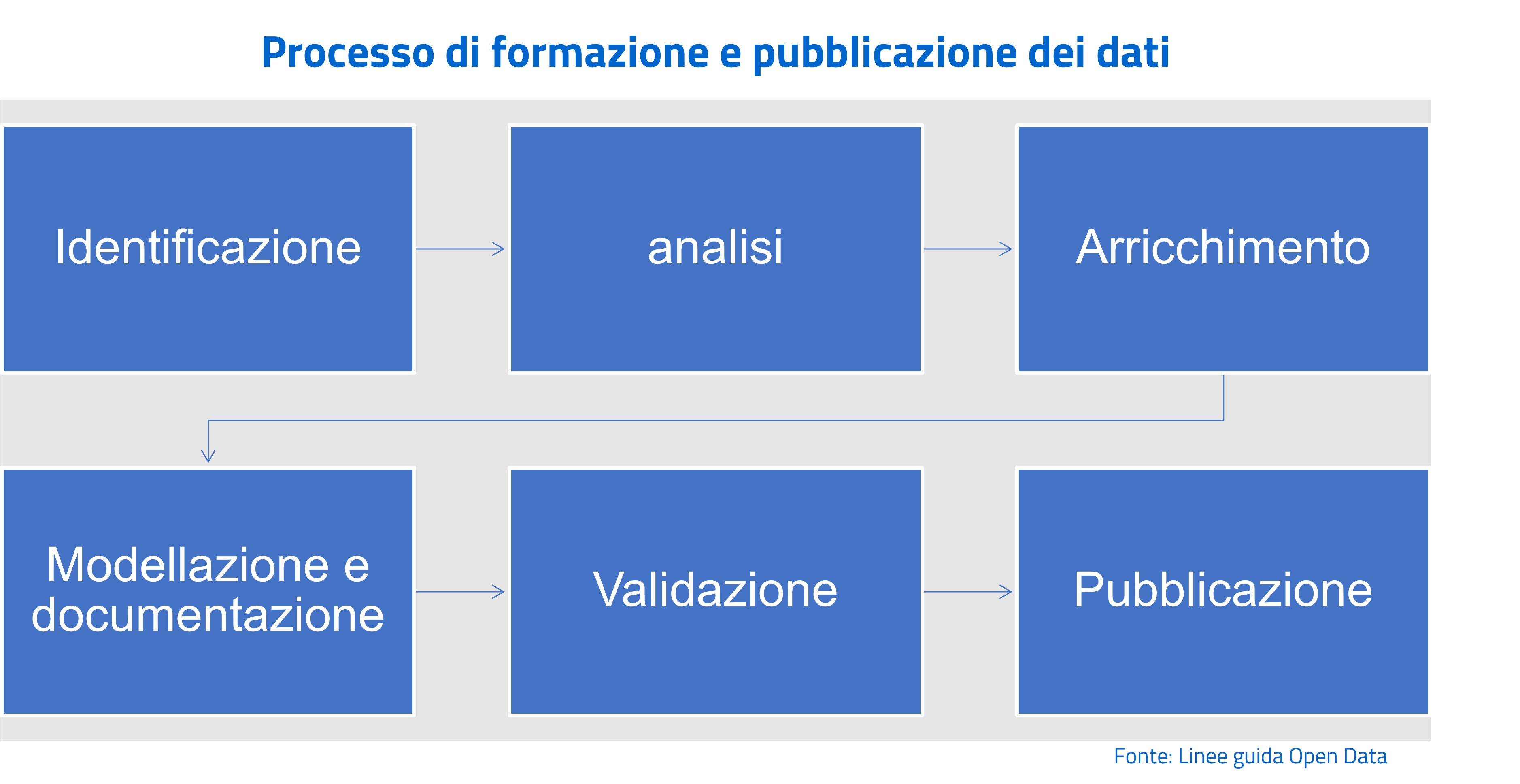 Per quanto riguarda i dati, il Piano rimanda alle “Linee guida recanti regole tecniche per l’apertura dei dati e il riutilizzo dell’informazione del settore pubblico” (Linee guida Open Data) che forniscono un approccio complessivo alla data governance, fornendo modelli e processi di apertura ed interoperabilità dei dati. Il processo di formazione e pubblicazione dei dati proposto dalle Linee guida si compone delle seguenti fasi.